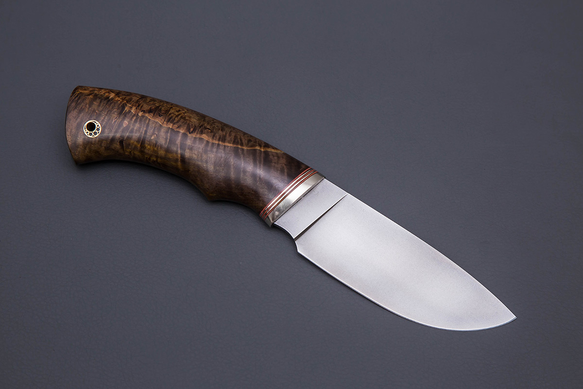 Нож из стали  M398 «Разделочный», рукоять притин мельхиор, стабилизированный кап клена