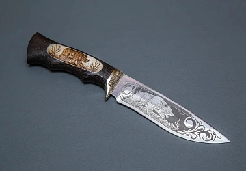 Нож из дамасской стали «Близнец» с гравировкой, рукоять литье охота,черное дерево,инкрустация
