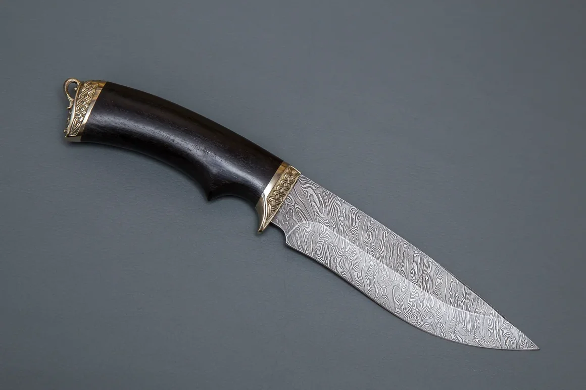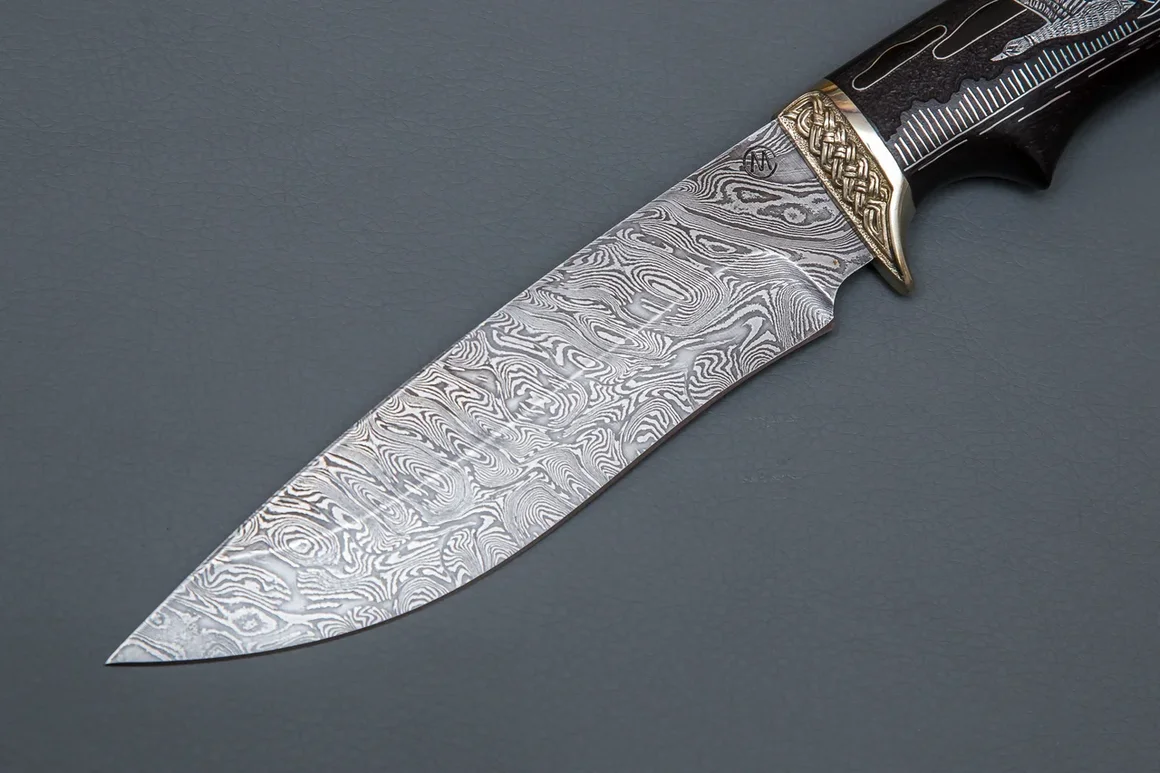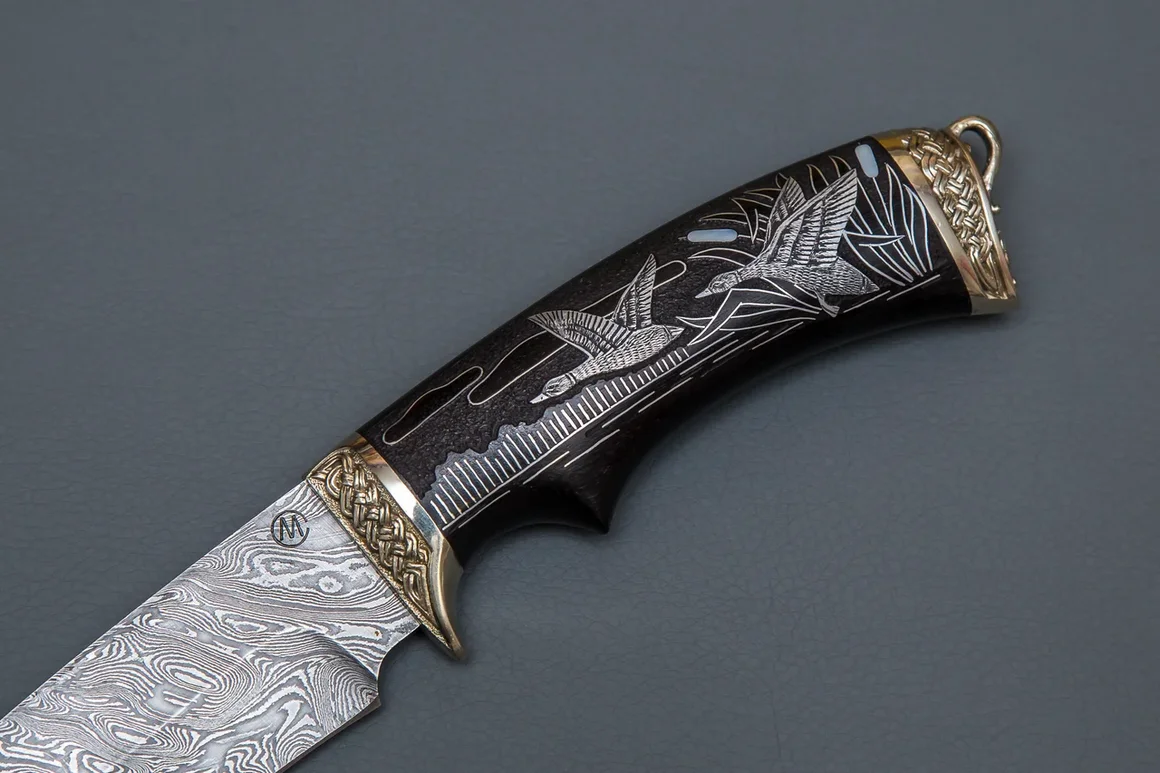 Нож из дамасской стали «Близнец» с гравировкой, рукоять литье охота,черное дерево,инкрустация