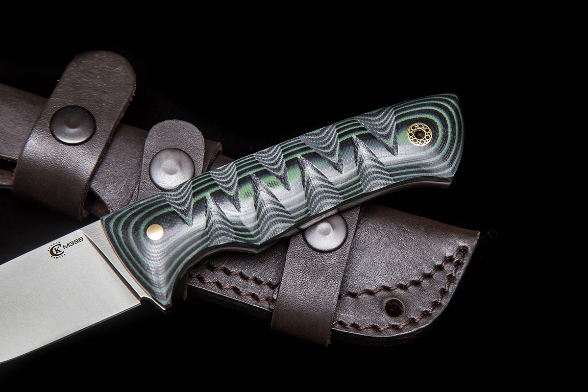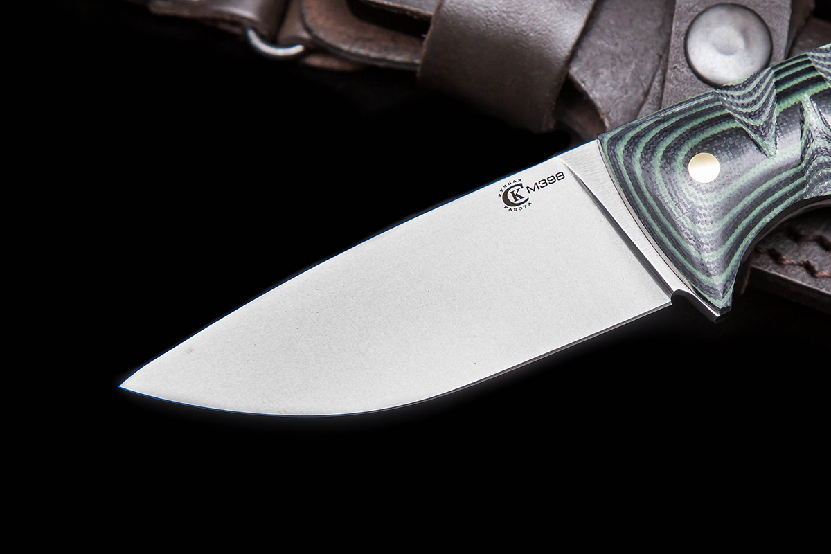 Название «фултанг» произошло от английского full tang – полный хвостовик. В соответствии с определением фултанг – цельнометаллический нож с широкой хвостовой частью, сделанной для удобного хвата рукой и повышенной прочности. Цельнометаллические ножи, очевидно, самые прочные, ведь в них стальная часть служит и клинком, и рукоятью, которая обычно по бокам закрывается дополнительными накладками. Это простой и надёжный нож, который отлично подходит для выхода на природу, в том числе и для выживания. В стали M398 содержится на 30% больше углерода, что добавляет ей твердости, помимо этого, в стали повышенное содержание хрома и ванадия, что обеспечивает коррозионную стойкость и делает материал стойким к износу, достаточно хорошо выдерживает ударные нагрузки, длительное сохранение остроты режущей кромки. Благодаря высокому содержанию хрома, сталь устойчива к коррозии. Сталь М398 твердость которой составляет 60-63 HRC, что делает нож идеальным для туризма, охоты и активного отдыха на природе